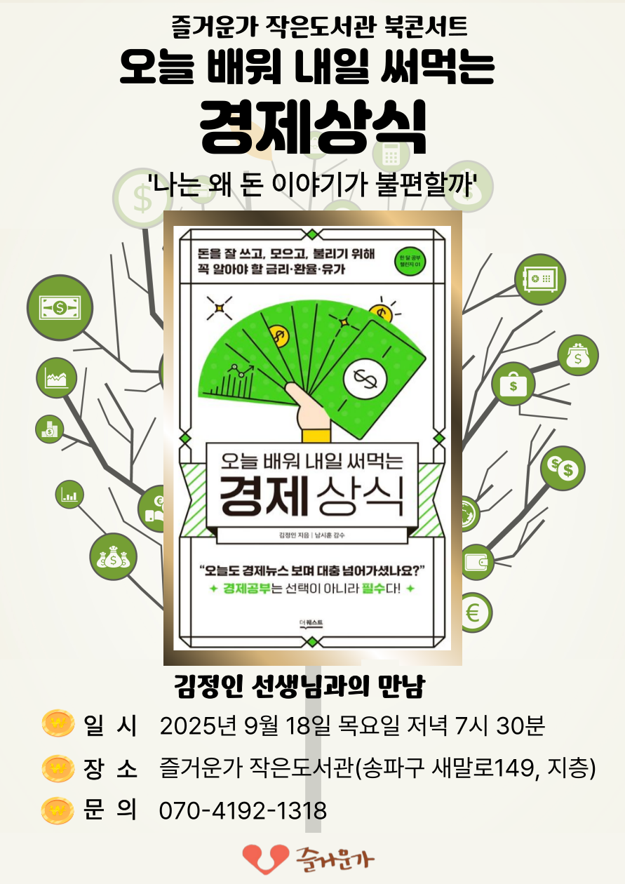즐거운가 작은도서관 북콘서트 ‘오늘 배워 내일 써먹는 경제상식’에 많은 관심과 참여 부탁드려요~!